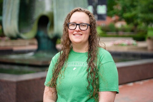 student outside on campus smiling at the camera and showing a Go Herd sign with her hands