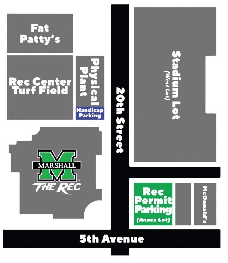 The suggested parking area is the Joan C. Edwards football stadium annex lot, located on 20th Street and Fifth Avenue, across from the Recreation Center. The lot is a permit lot and is patrolled by Marshall University on the weekdays from 7 AM to 7 PM, Monday through Thursday and from 7 AM to 4 PM on Friday.