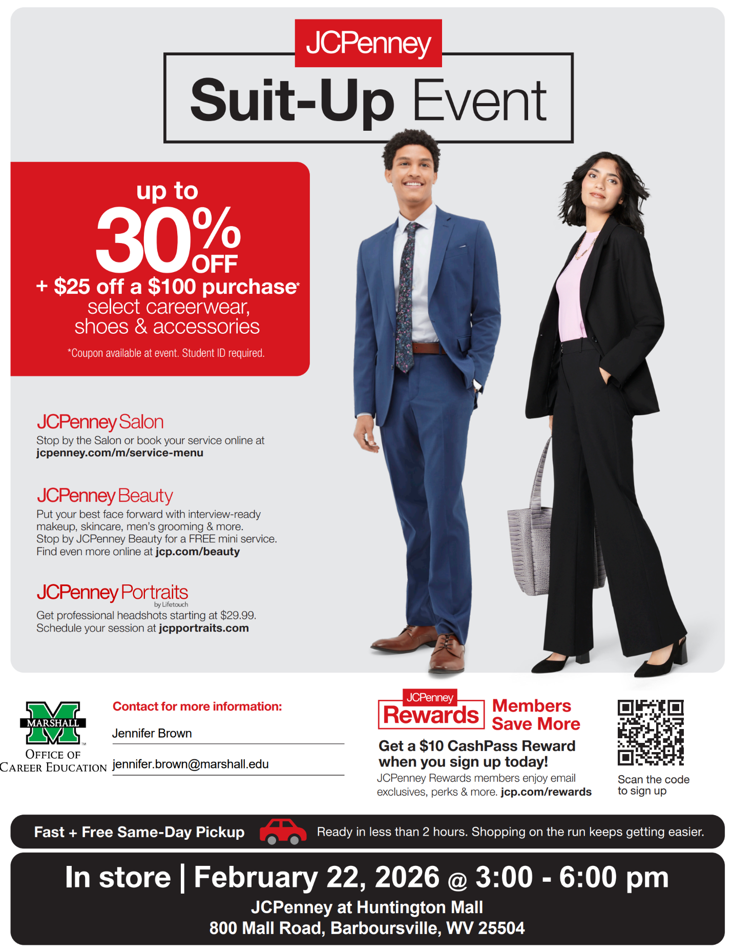 HUNTINGTON, W.Va. – Marshall University’s Office of Career Education and JCPenney at the Huntington Mall are teaming up to offer JCPenney Suit Up from 3-6 p.m. Sunday, February 22 at the Huntington Mall.