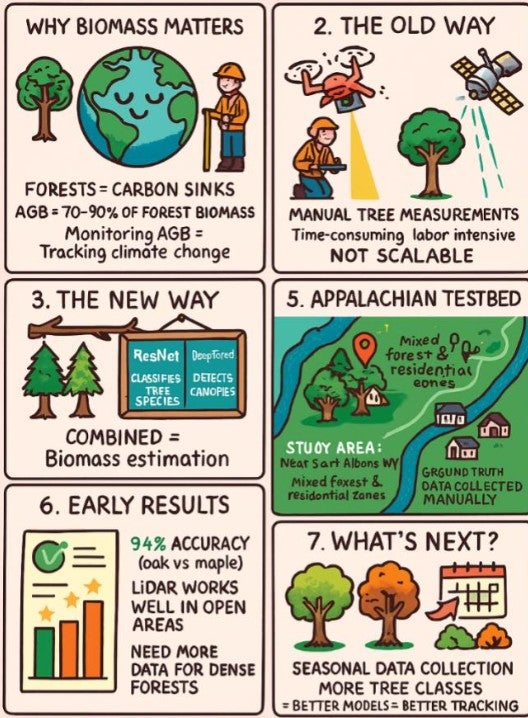 Abstract: This study explores a modern approach to estimating forest biomass using drone imagery, satellite LiDAR, and machine learning. Traditional biomass measurement methods are labor-intensive and slow, prompting the need for scalable, remote techniques. Researchers developed models to identify tree species and estimate biomass based on canopy size and height, even in areas with limited ground-truth data. Early results show promise, especially in open forest regions, though more data is needed for dense environments. The project highlights the potential of combining accessible technologies with AI to monitor forest health and carbon stocks, contributing to climate change research and environmental management.