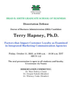 The Marshall University Doctor of Business Administration (DBA) program is a research-based doctoral program that combines a disciplined approach to scholarship with a focus on compelling problems of practice. The DBA program is a 66-credit hour, three-year, hybrid program that requires students to prepare an applied research proposal and dissertation. Students will study seminal and contemporary business literature to develop research questions in their area of interest. They will perform literature reviews, design and perform research studies, analyze data, and draw relevant conclusions that affect economic development and business innovation. Students will choose a concentration that focuses on one broad business area, and they will be required to complete a proposal and dissertation as part of the program.