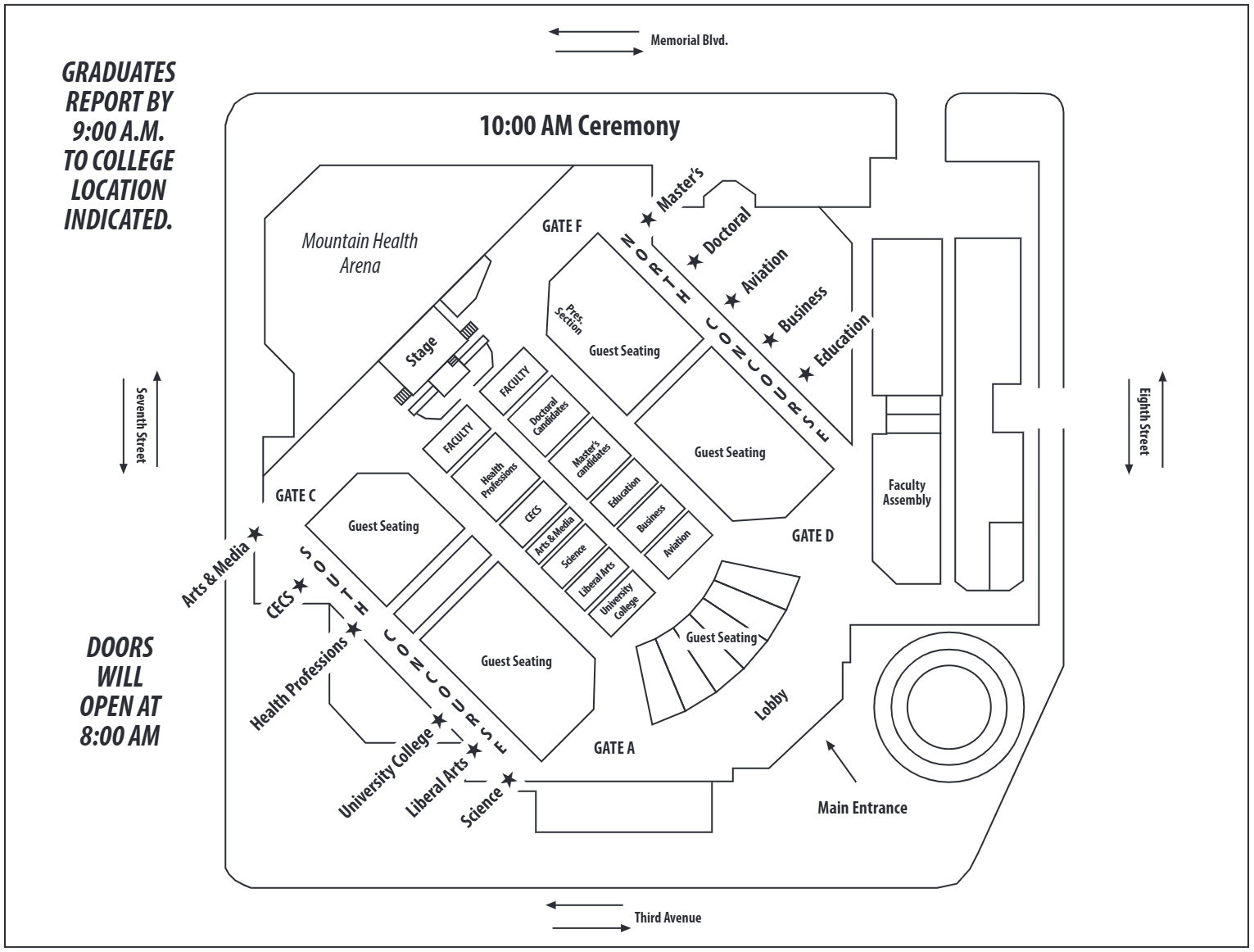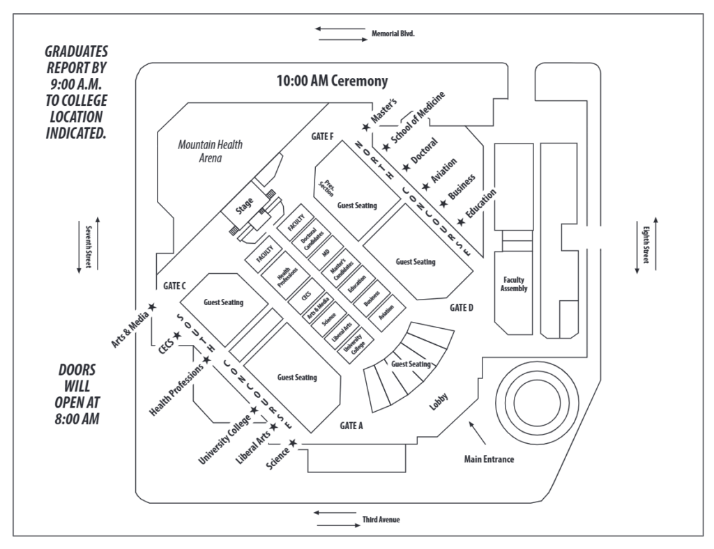 - Please enter the arena through the main entrance on Third Avenue and Eighth Street and report to the area designated for each college (see attached diagram).