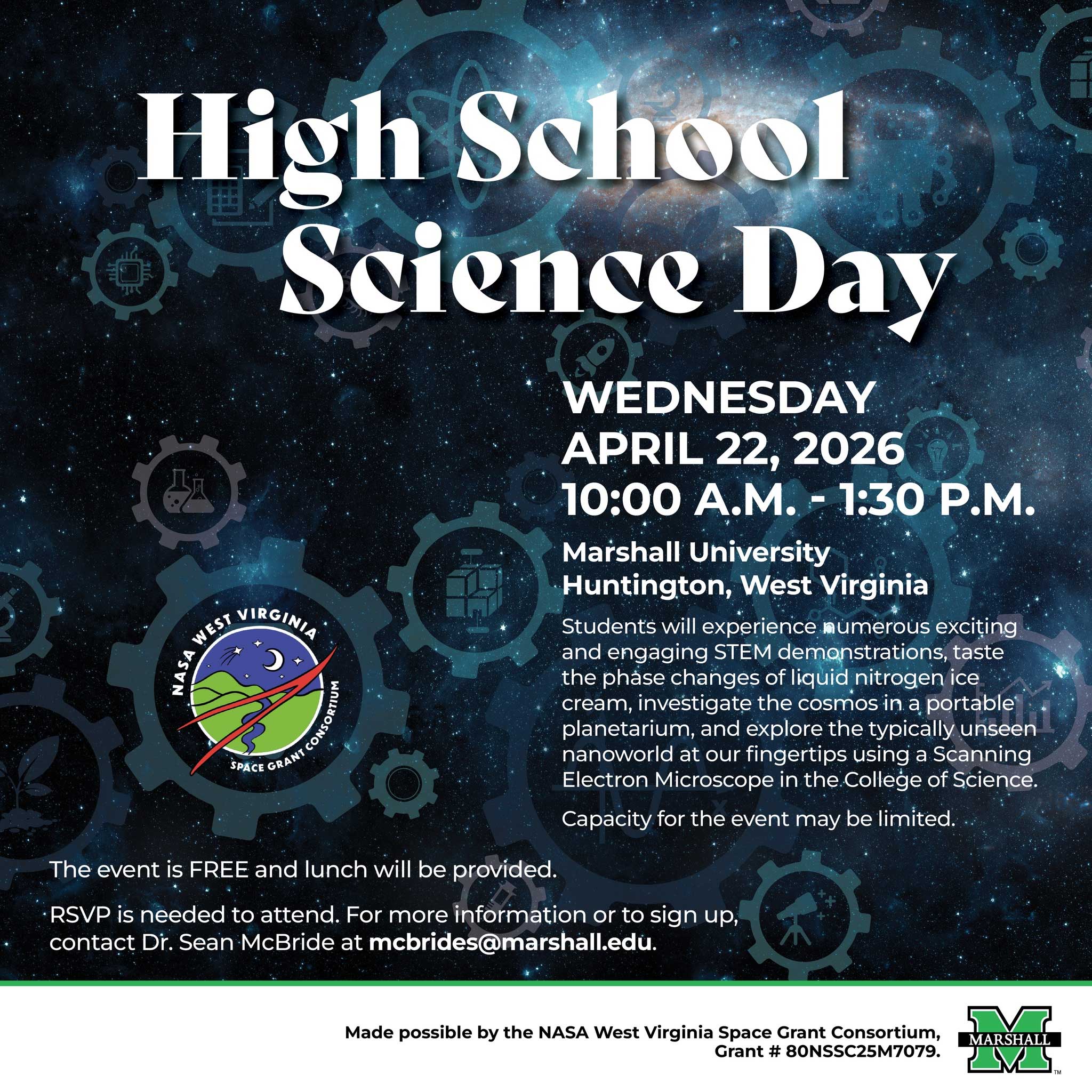 The Marshall University College of Science invites high school students from across the region to campus for High School Science Day on Wednesday, April 22, 2026, from 10 a.m. to 1:30 p.m. in Huntington, West Virginia. The event is free, and lunch is included.