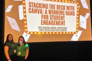 Two Marshall University staff members presented their innovative approach to student engagement at the 2025 NACADA Annual Conference. Paige Kennedy, program manager and academic advisor in the College of Science Office of Student Services, and Emily Reeves, student services specialist in the University College, co-presented their session titled “Stacking the Deck with Canva: A Winning