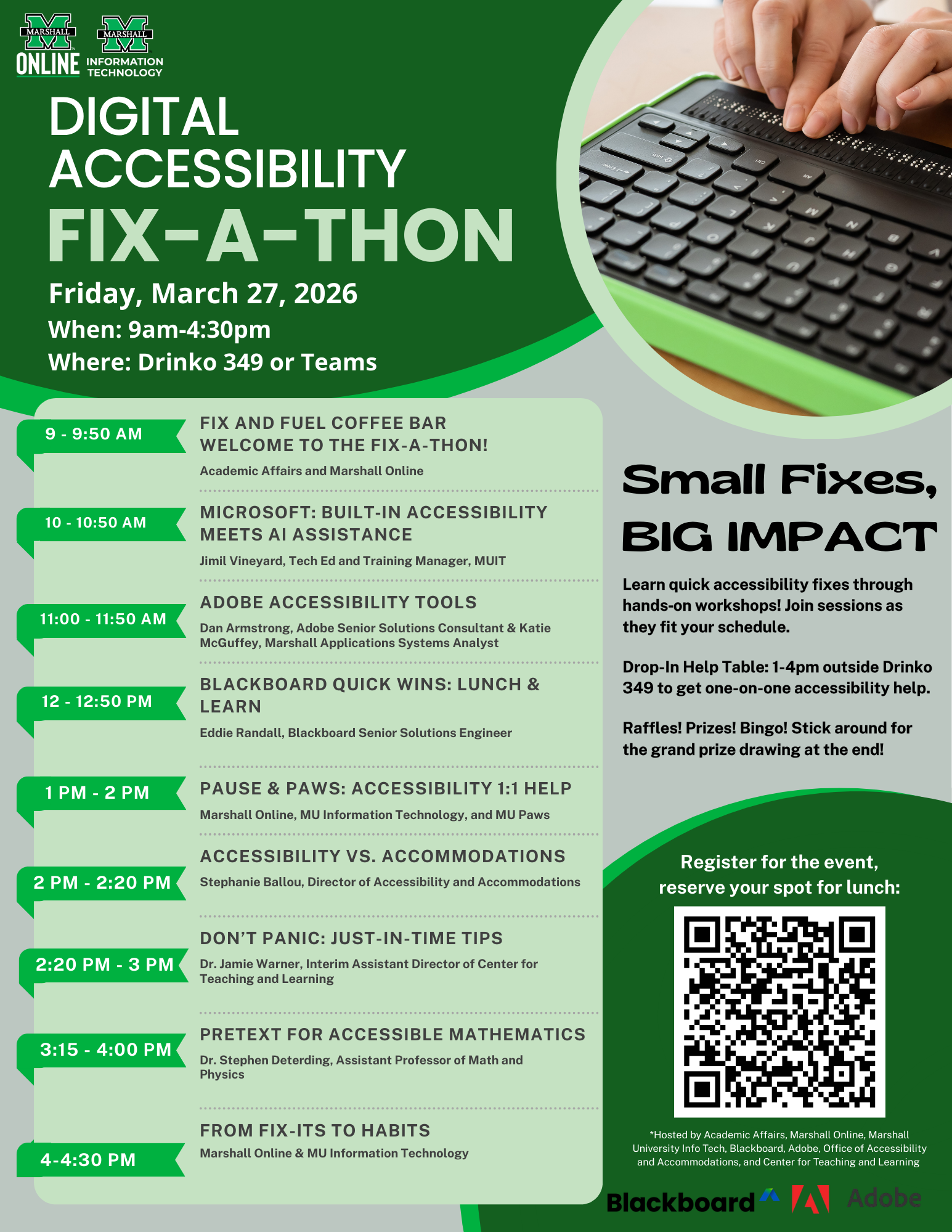DON’T PANIC! Marshall needs to comply with federal digital accessibility standards by April 24, 2026, and we are here to support you! Join us for Marshall’s Digital Accessibility Fix-a-Thon – a day of quick-fix workshops and drop-in help sessions hosted by Marshall Online, MUIT, Blackboard, CTL, and Adobe.
