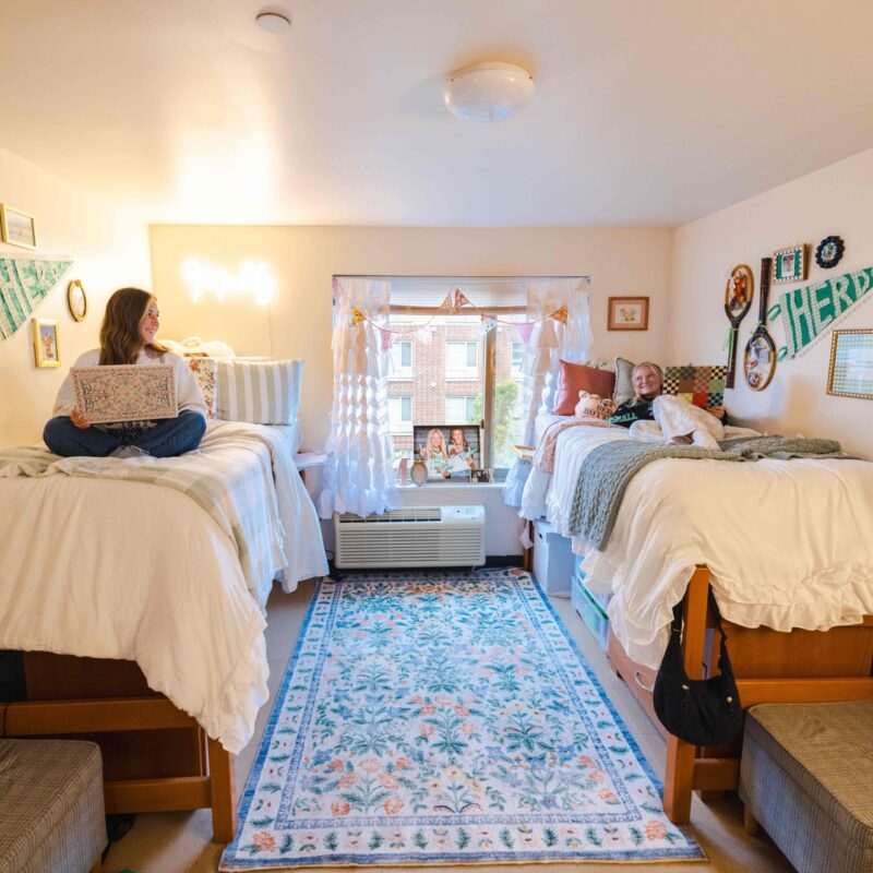 Typical rooms include two beds, two mattresses (twin XL), two desks, two chairs, two dressers, built-in closets and a full bathroom.