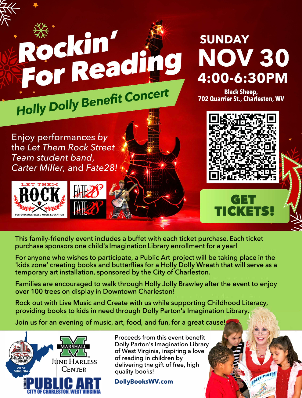Join us at Black Sheep in Charleston, WV for an evening of music, art, food, and fun, all for a good cause! Proceeds purchase and deliver Dolly Parton’s Imagination Library books to West Virginia children!