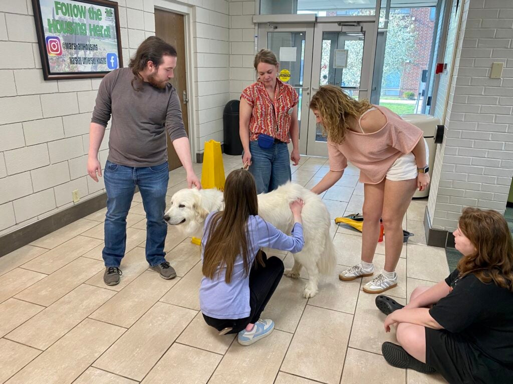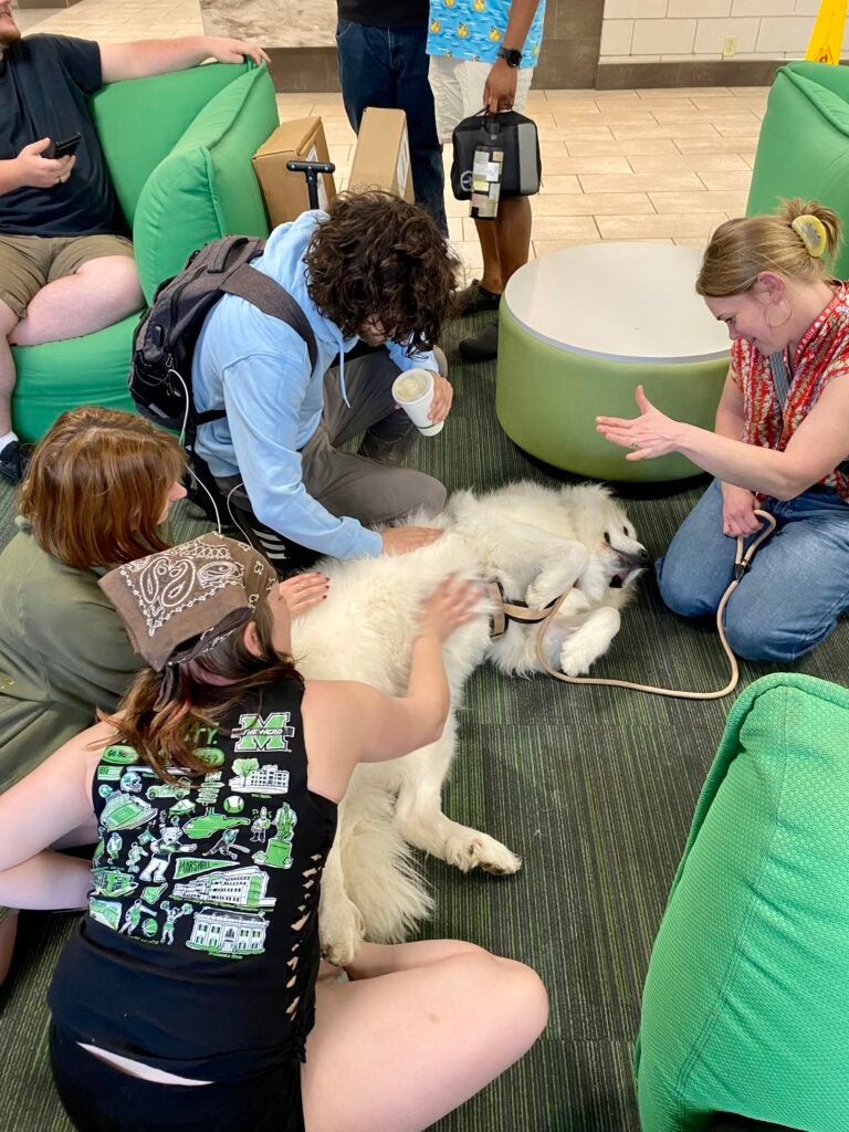 Photoshoot with Marshall University Brand Services, summer 2024 featuring student Isabella Masters, therapy dog Isabella, and handler Robin Ash.
