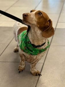 Chloe, the teeny weenie, is a small but mighty mini-dachshund. There is a lot of personality in that little body, and she is proof that age is just a number. Don’t let her advanced years fool you; Chloe is still full of life, and she loves visiting with students. She also loves the squirrels and birds on campus and is convinced she can catch one of them. At home Chloe is in charge of her younger but much larger her mastiff and pit bull brothers. In addition to spending time in First Year North, she has her own Paw-ffice in the Center for Student Success in East Hall where her handler works.