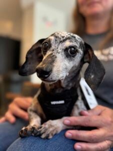 Ruben the dachshund is a regal fellow and a bit of a Casanova, as he tends to cozy up to the ladies when attending on-campus events. A typical dachshund, he has an excellent sense of smell and is adept as sniffing out treats. You will not meet a more determined finder of food. He loves attention and will use those puppy dog eyes to his advantage. In addition to volunteering with MU PAWS, Ruben gives back to the veteran community by volunteering at the VA with his handler who is a veteran herself.