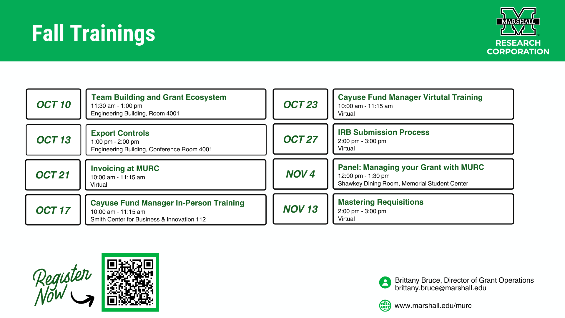 At the Marshall University Research Corporation (MURC), we are committed to empowering principal investigators (PIs), faculty, and staff with the tools and knowledge they need to confidently navigate every stage of the grant process. Through comprehensive trainings offered each Fall and Spring—as well as customized, on-demand sessions—we aim to ensure our research community feels supported, informed, and prepared to pursue and manage grant-funded initiatives successfully. To schedule a tailored workshop for your team, please contact Brittany Bruce, Director of Grant Operations.