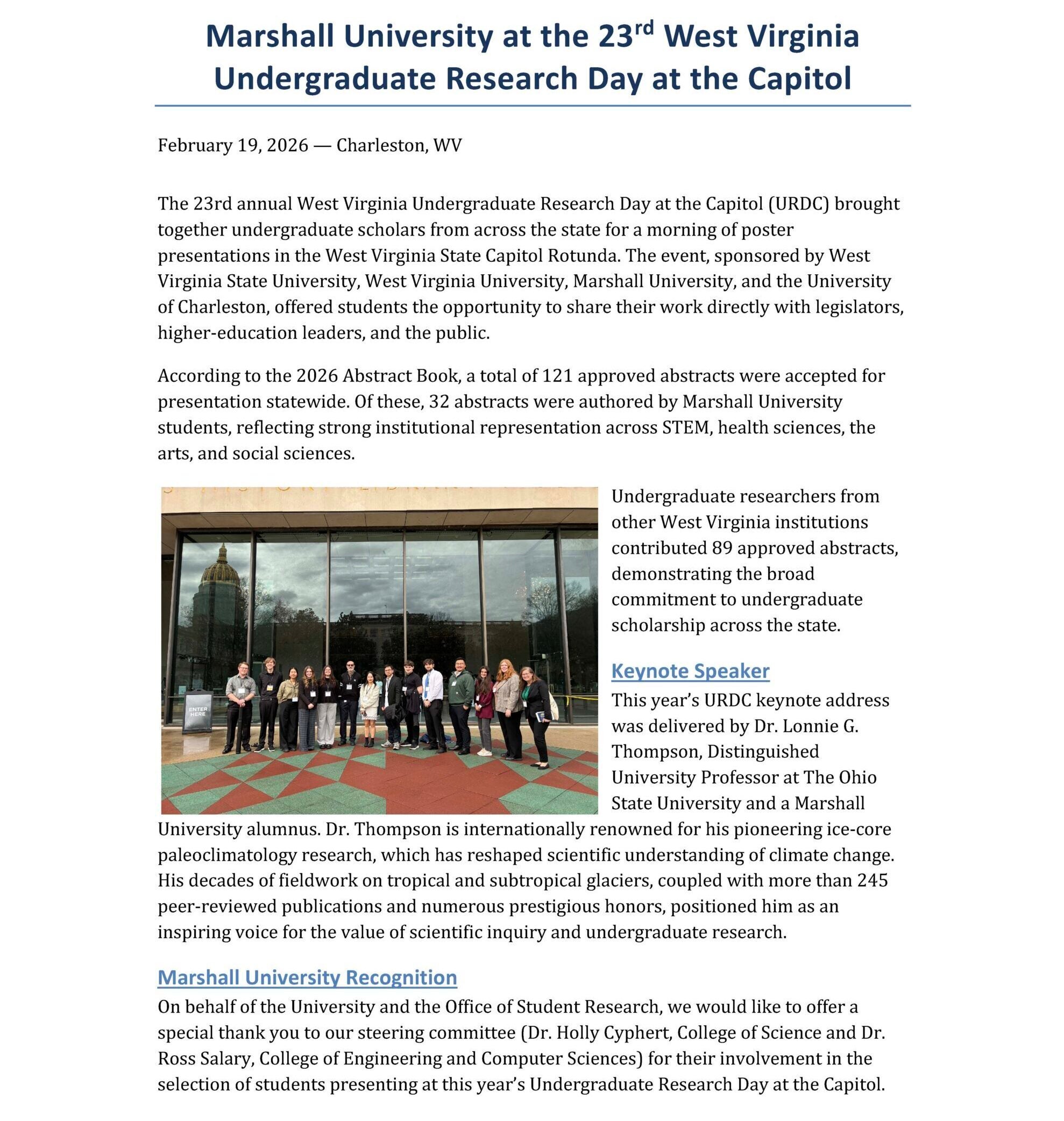 The 22nd edition of the annual West Virginia Undergraduate Research Day at the Capitol (URDC) was held on March 25, 2025. Marshall University was represented by 38 selected undergraduate student researchers from the College of Science, College of Engineering and Computer Science, the School of Medicine Biomedical Science program, College of Health Professions, College of Business, and the College of Liberal Arts.