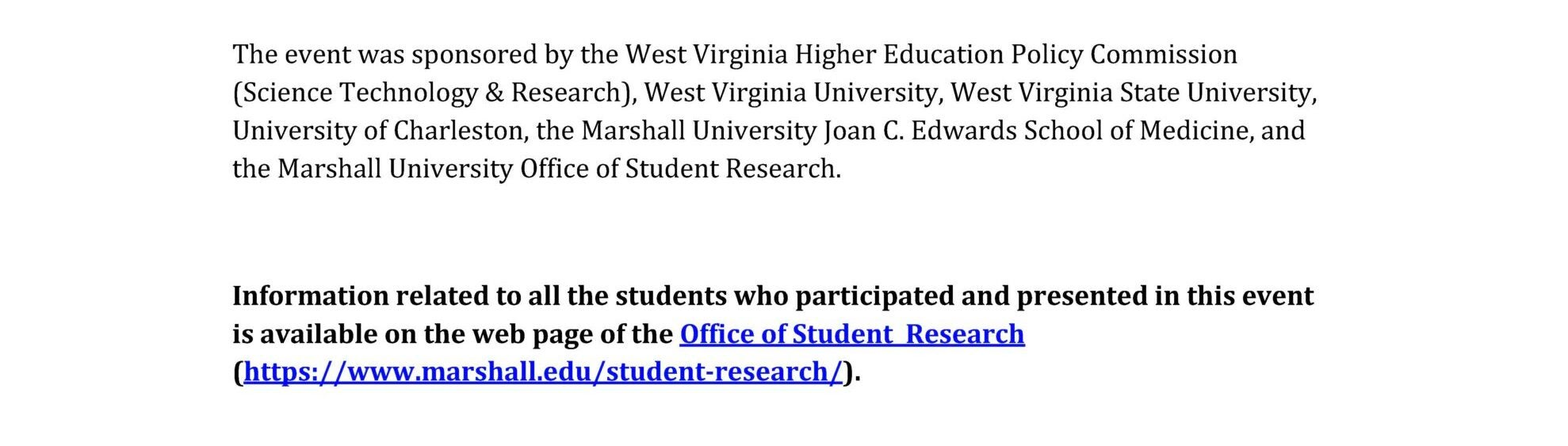 The event was sponsored by the West Virginia Higher Education Policy Commission (Science Technology & Research), West Virginia University, West Virginia State University, University of Charleston, the Marshall University Joan C. Edwards School of Medicine, and the Marshall University Office of Student Research.