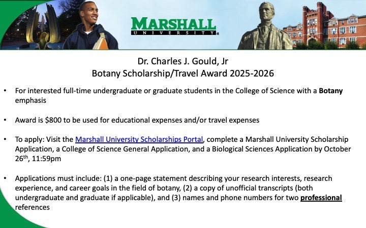 - Dr. Charles J. Gould, Jr Botany Scholarship/Travel Award – $800 – open to full-time undergraduate and graduate students who are conducting research.