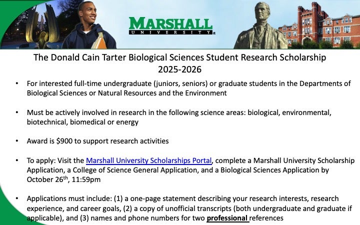 - Donald Cain Tarter Biological Sciences Student Research Scholarship – $900 – open to full-time undergraduate (juniors, seniors) and graduate students who are conducting research.
