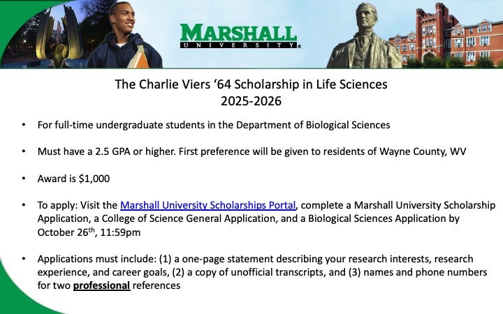 - Charlie Viers ‘64 Scholarship in Life Sciences – $1,000 – open to full-time undergraduate students only, with first preference given to residents of Wayne County, WV.