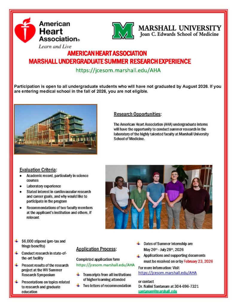 - Summer 2023: AHA Summer Internship opportunity for undergraduate students (deadline for application February 21, 2023). The grant from the American Heart Association will support undergraduate students summer research at Marshall University provides funds for five undergraduate students ($6,000/student, pre- tax and fringe benefits) to perform summer research in a laboratory at the School of Medicine. As part of the institutional support, Dean Miller has kindly agreed to provide $2,000 per student towards supplies or travel to conference costs.