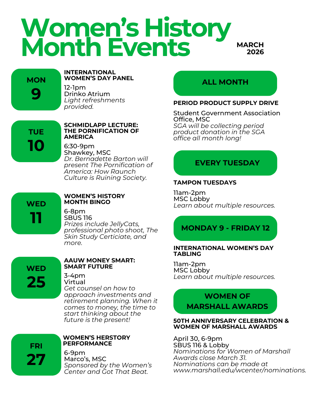 This year the Women’s Center celebrates 50 years of dedicated service to the students, faculty, and staff of Marshall. Help us celebrate while we continue to recognize the women, past and present, who make it all possible.